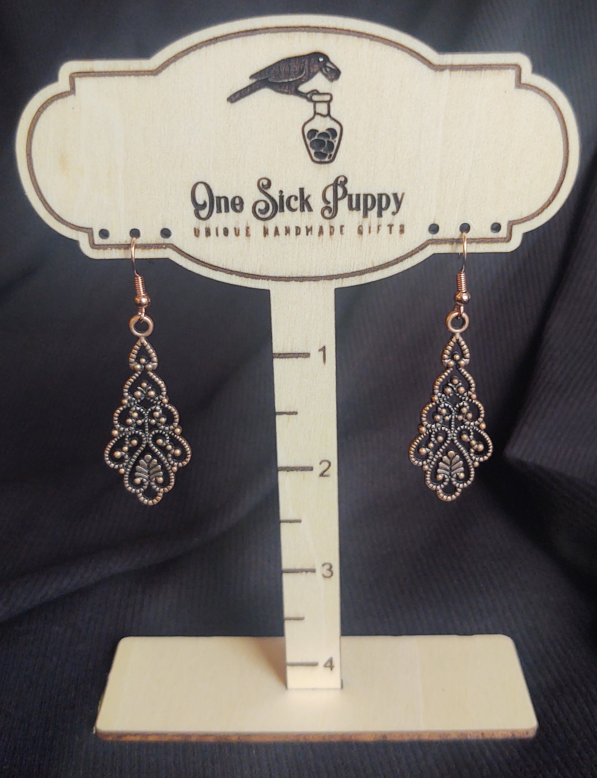 Made with ornate copper fillagree and featuring copper plated nickel free hooks, these earrings are both stylish and safe for sensitive ears.
