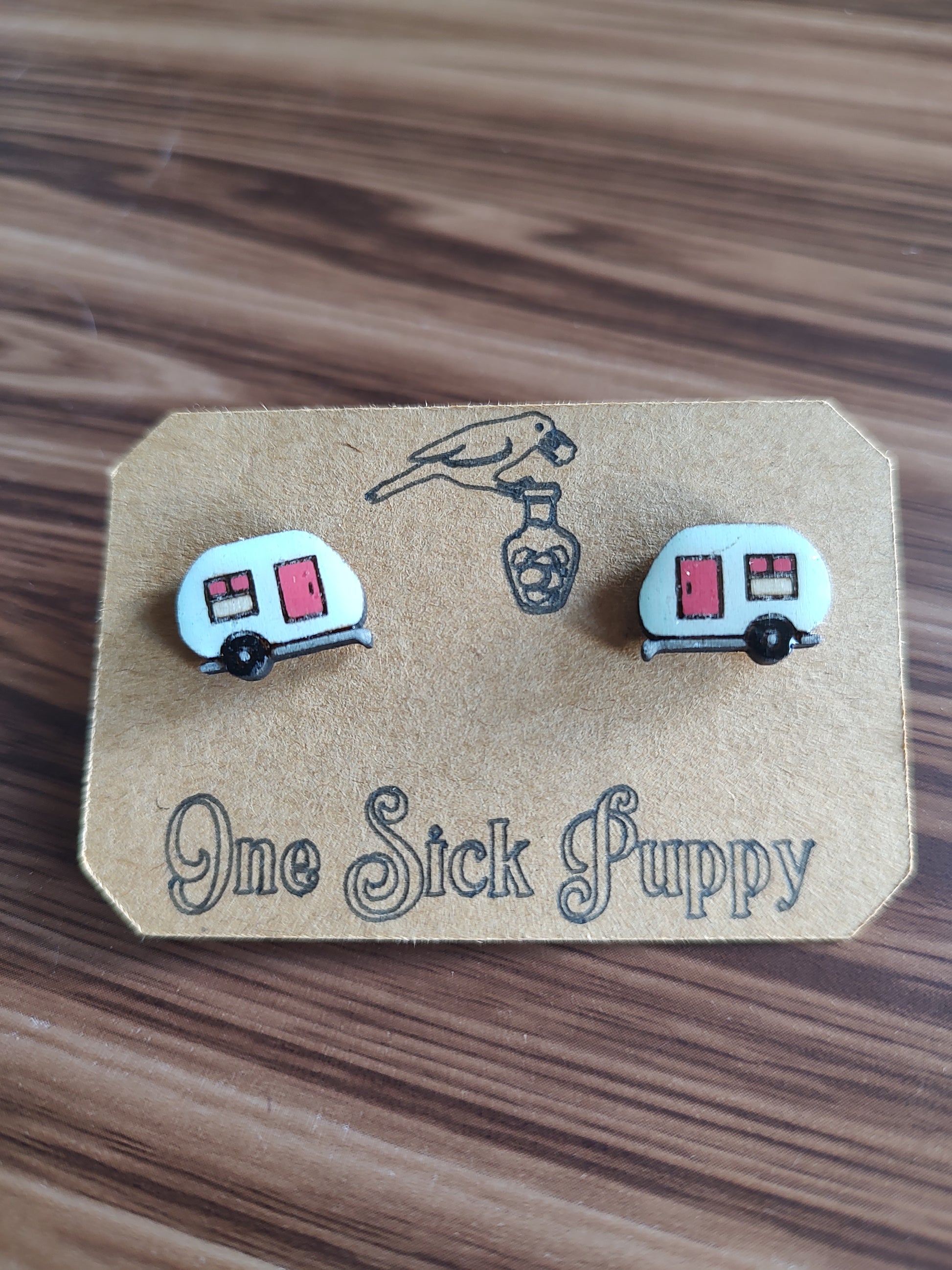 Laser cut resin topped wood earrings with nickel free stainless steel posts.