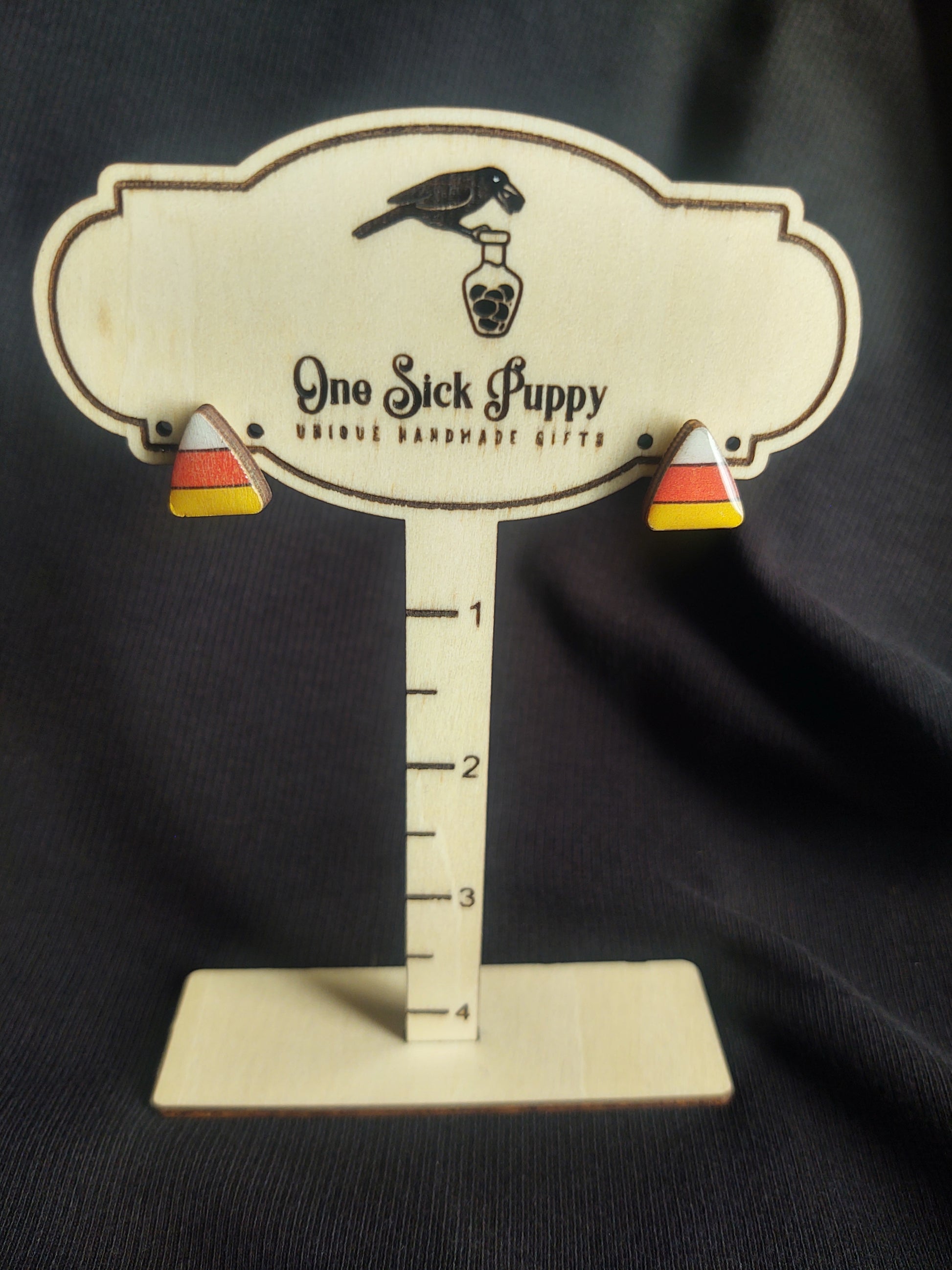 Laser cut resin topped wood earrings with nickel free stainless steel posts.