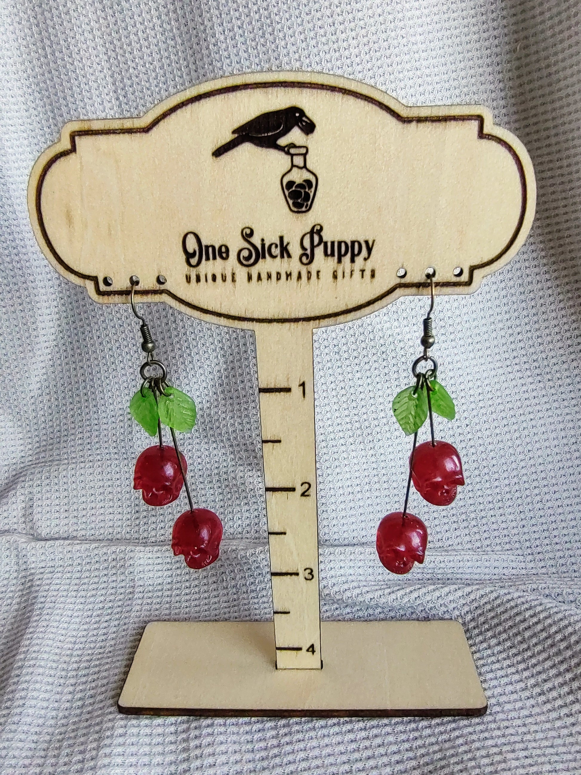 Acrylic resin cherry earrings with nickel free stainless steel accents and hooks.