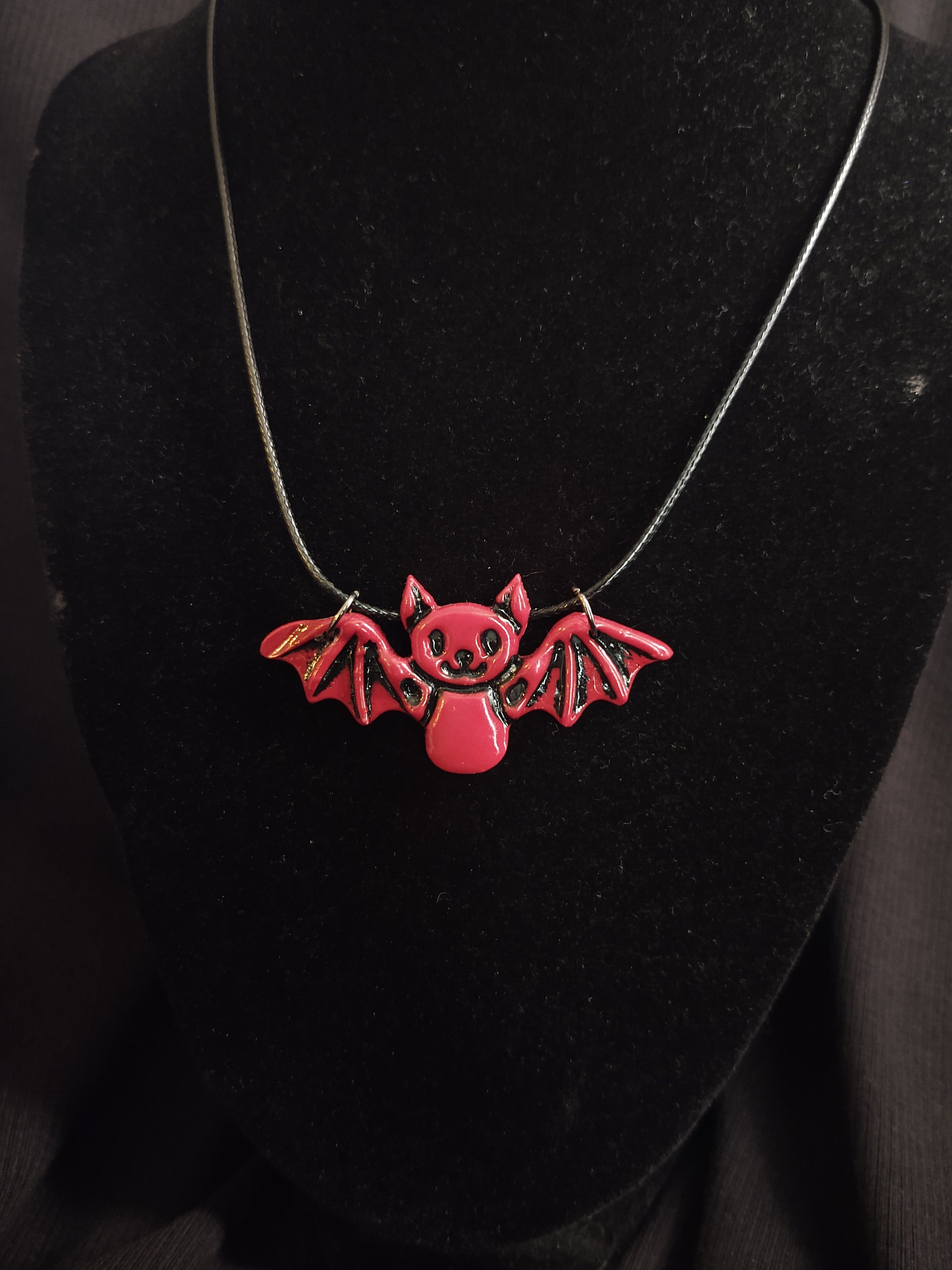 Polymer clay bat pendent on braided leather cord. Necklace length is 17'' extendable up to 19''.