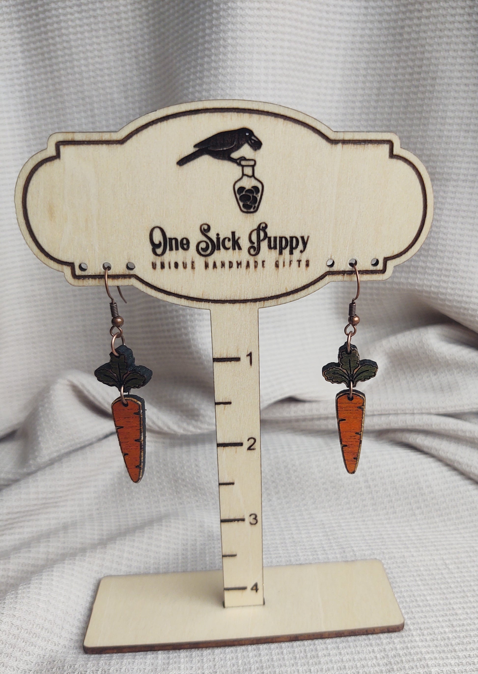 Laser cut dangle carrot earrings with bronze toned nickel free stainless steel hooks.