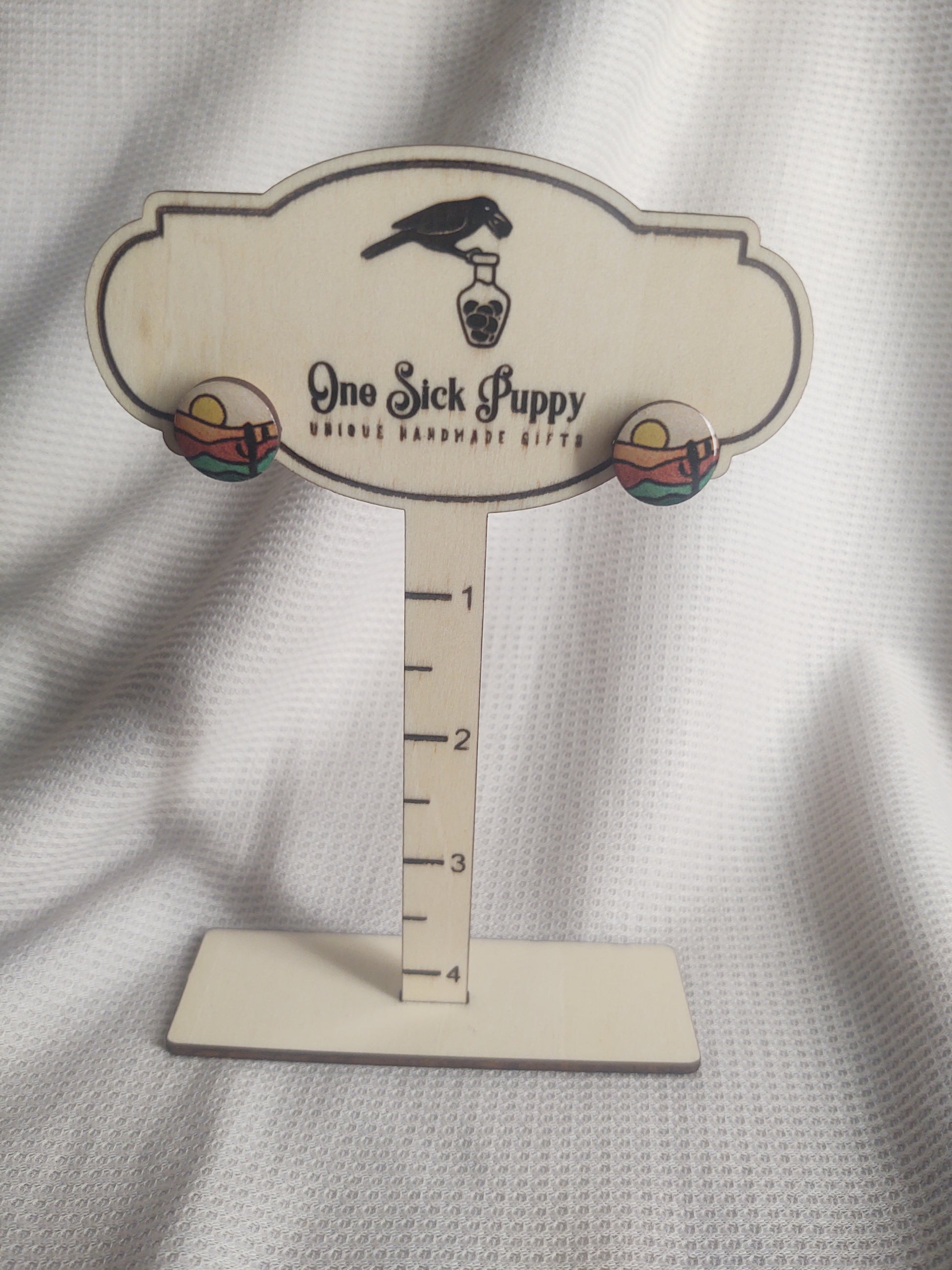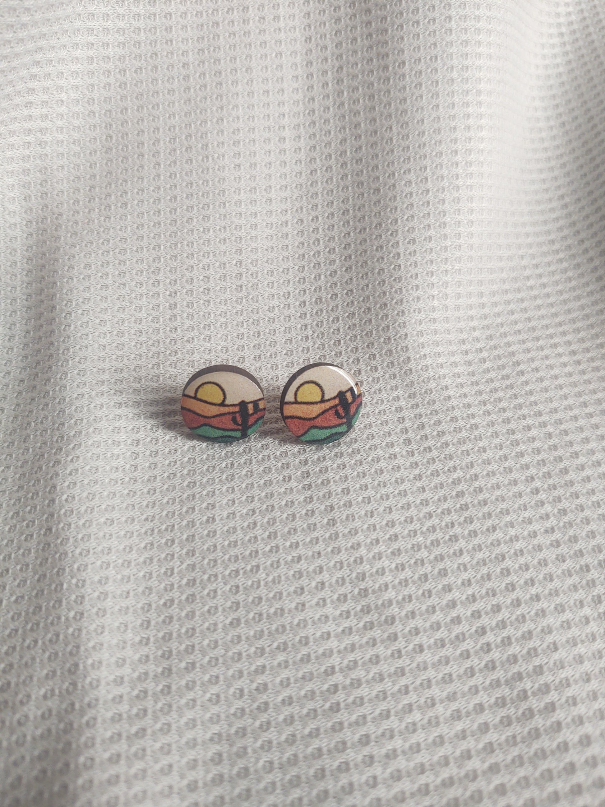 Laser cut resin topped wood earrings with nickel free stainless steel posts.