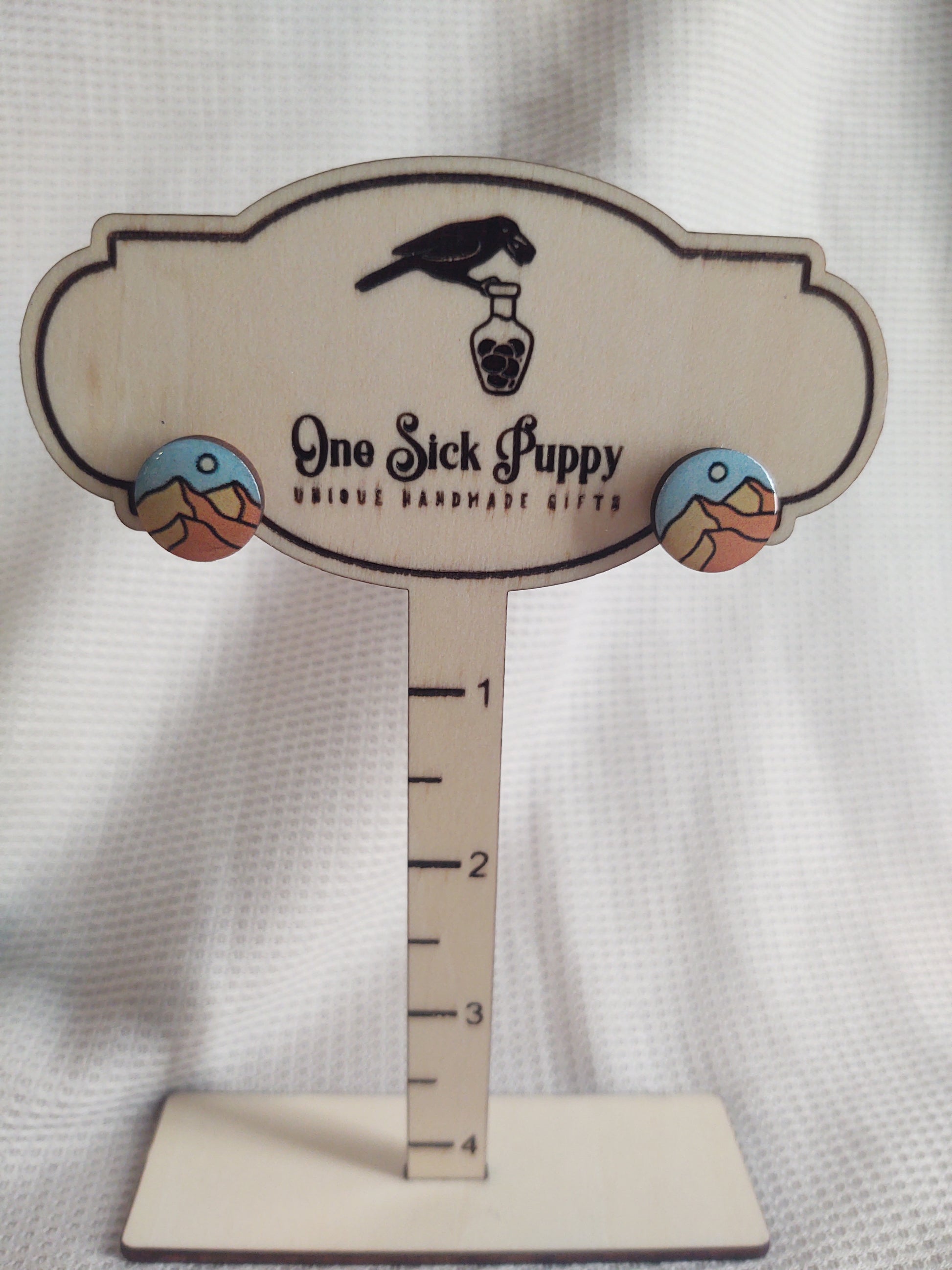 Laser cut resin topped wood earrings with gunmetal plated nickel free stainless steel posts.