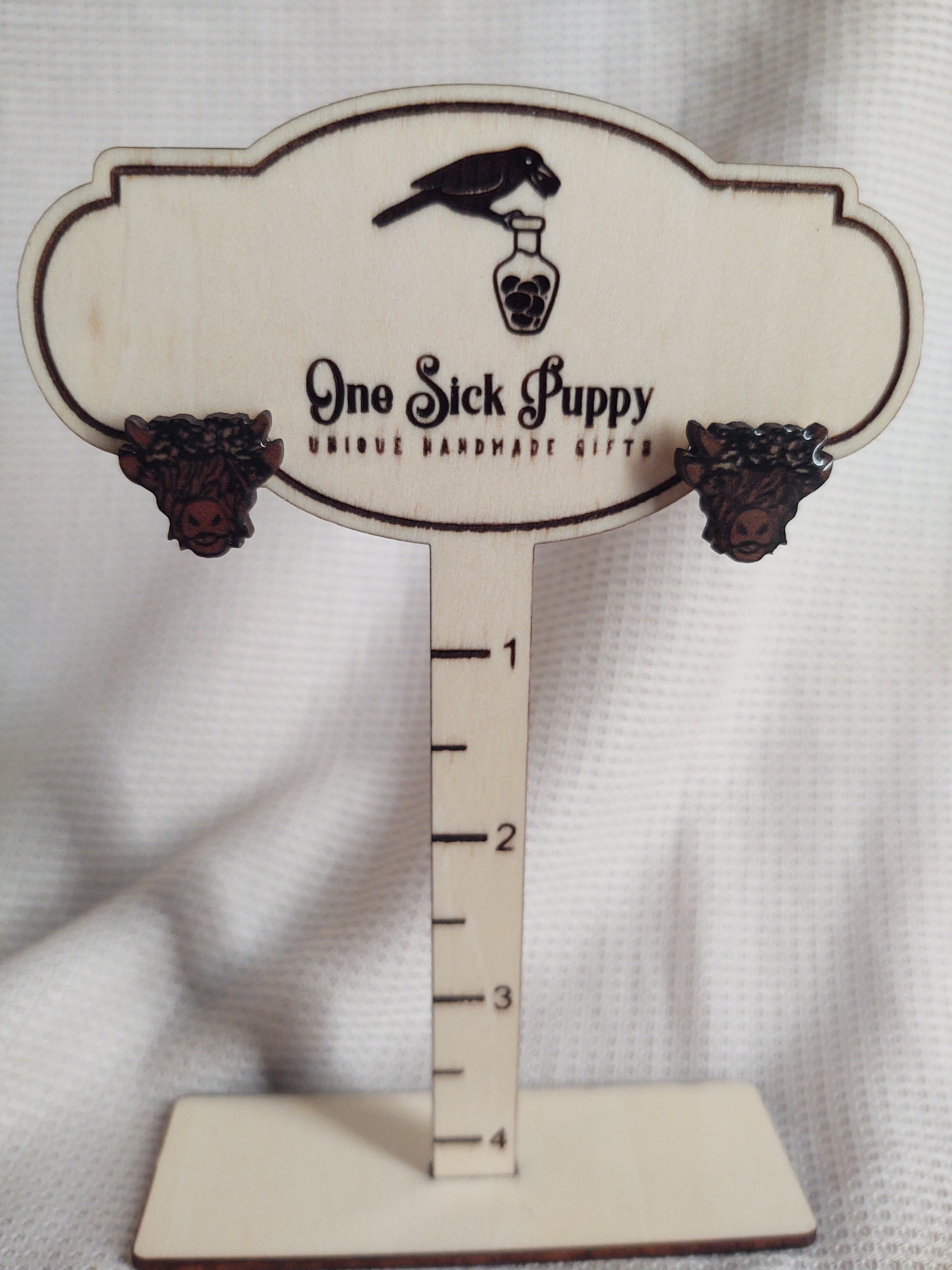 Laser cut resin topped wood earrings with gunmetal plated nickel free stainless steel posts.