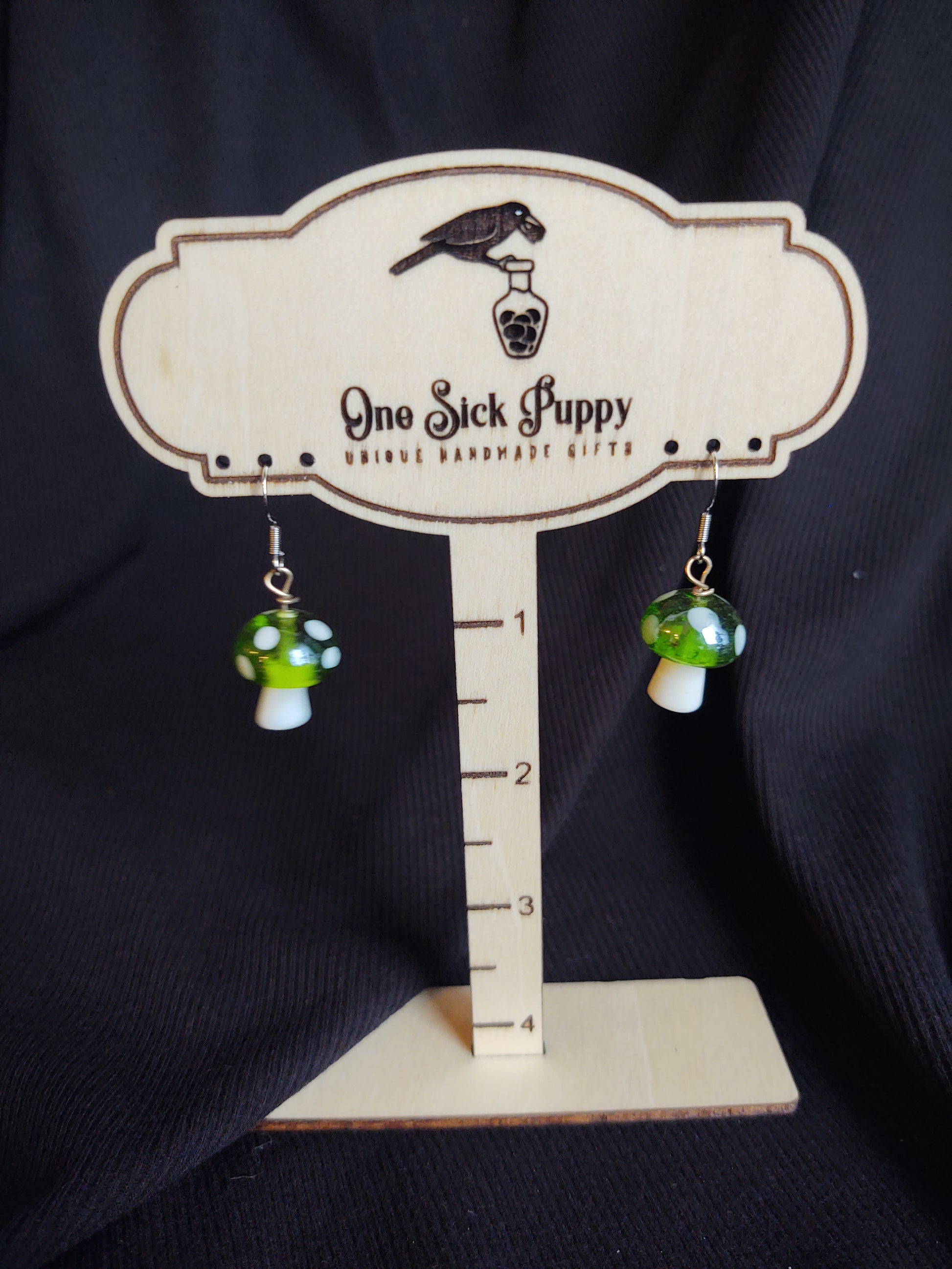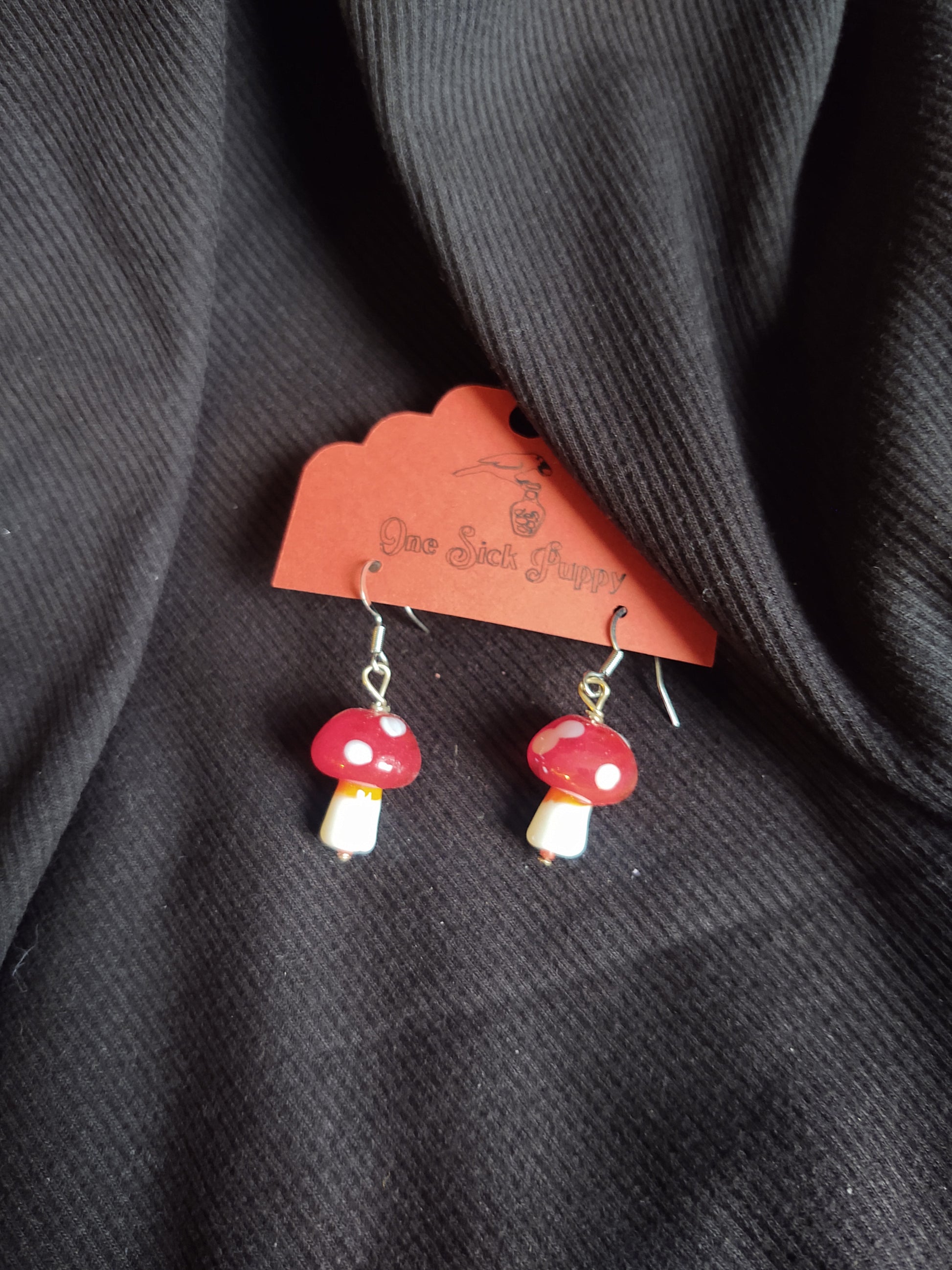 Glass mushroom dangle earrings with silver plated nickel free stainless steel hooks.