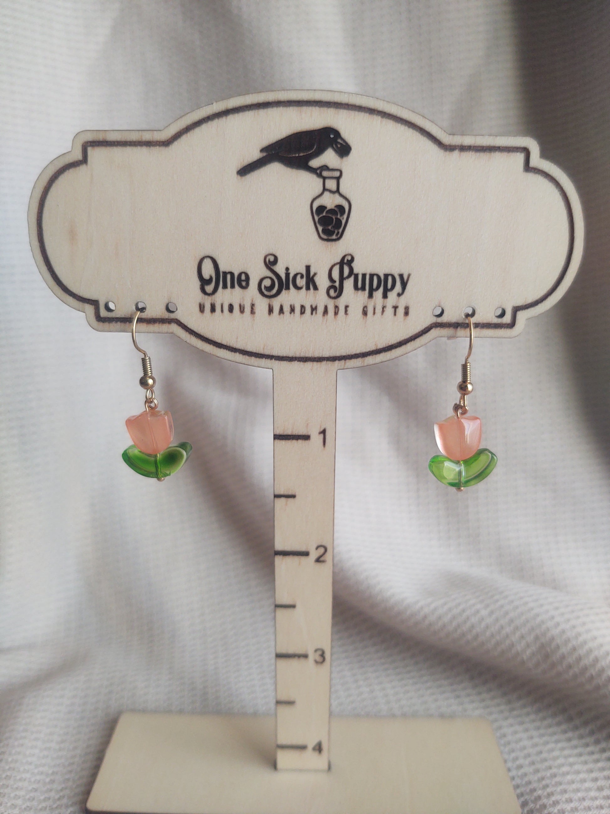 Glass tulip dangle earrings with bronze plated stainless steel hooks.