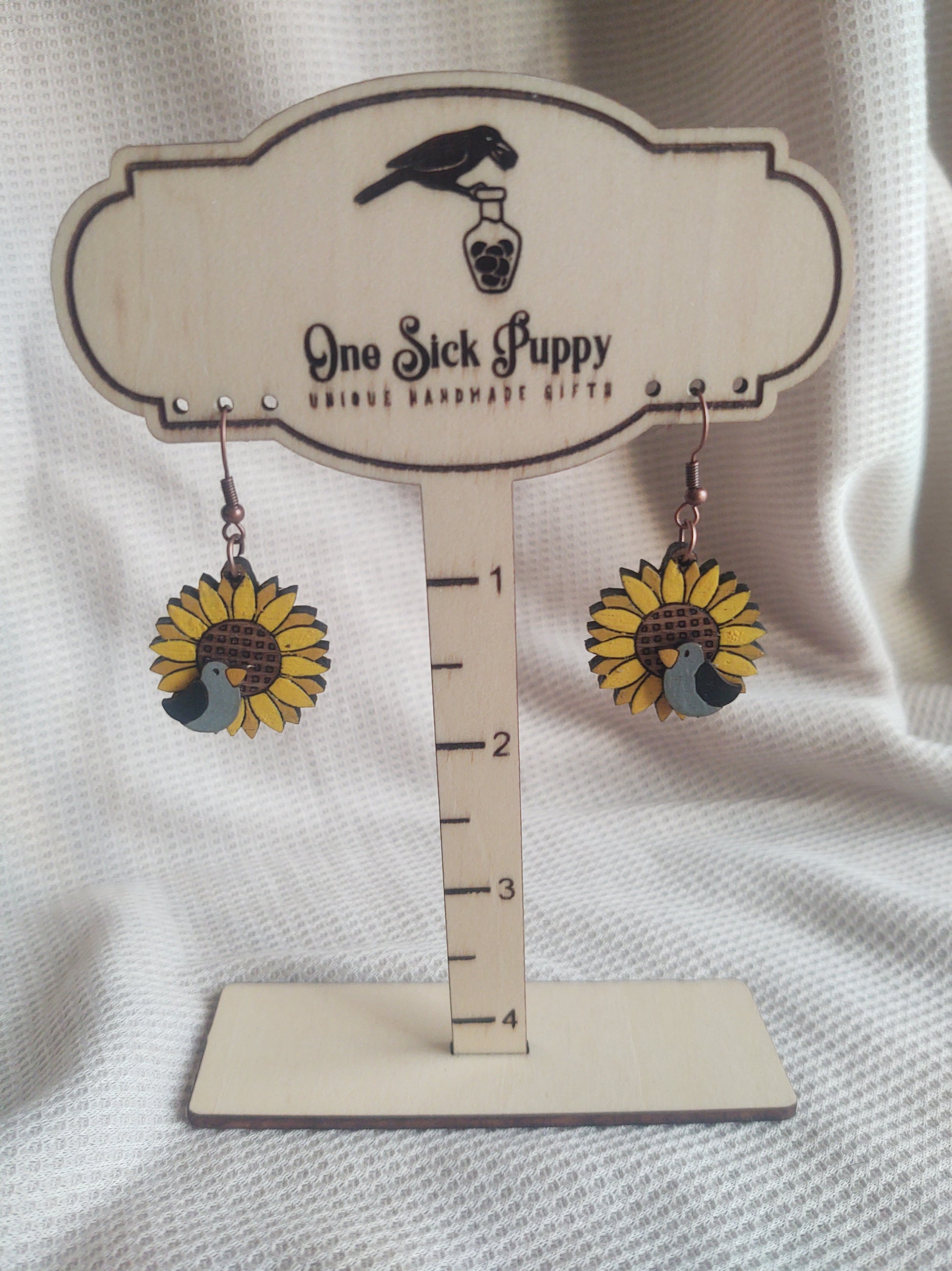 Laser cut hand painted wood earrings with bronze plated nickel free stainless steel hooks.