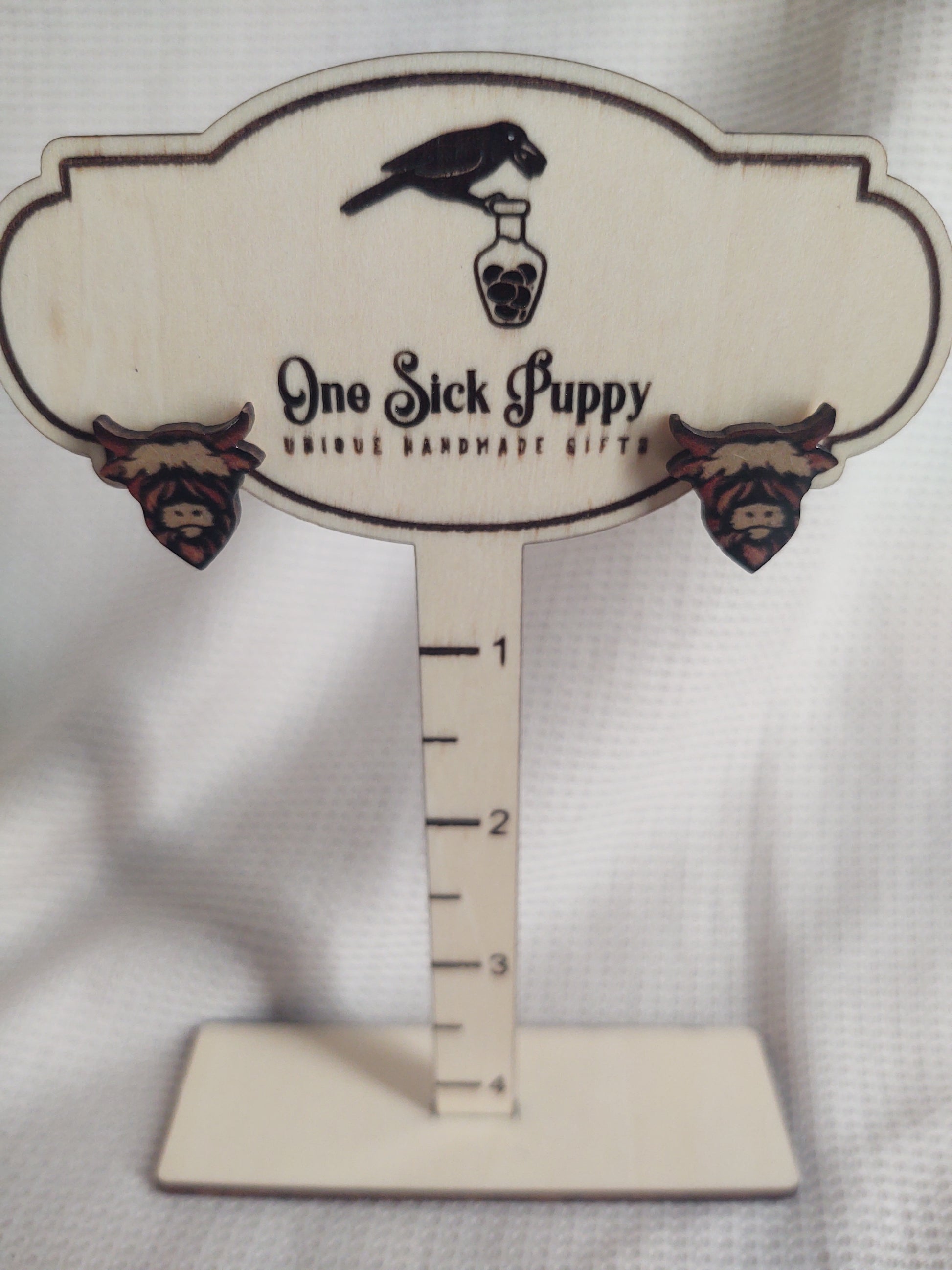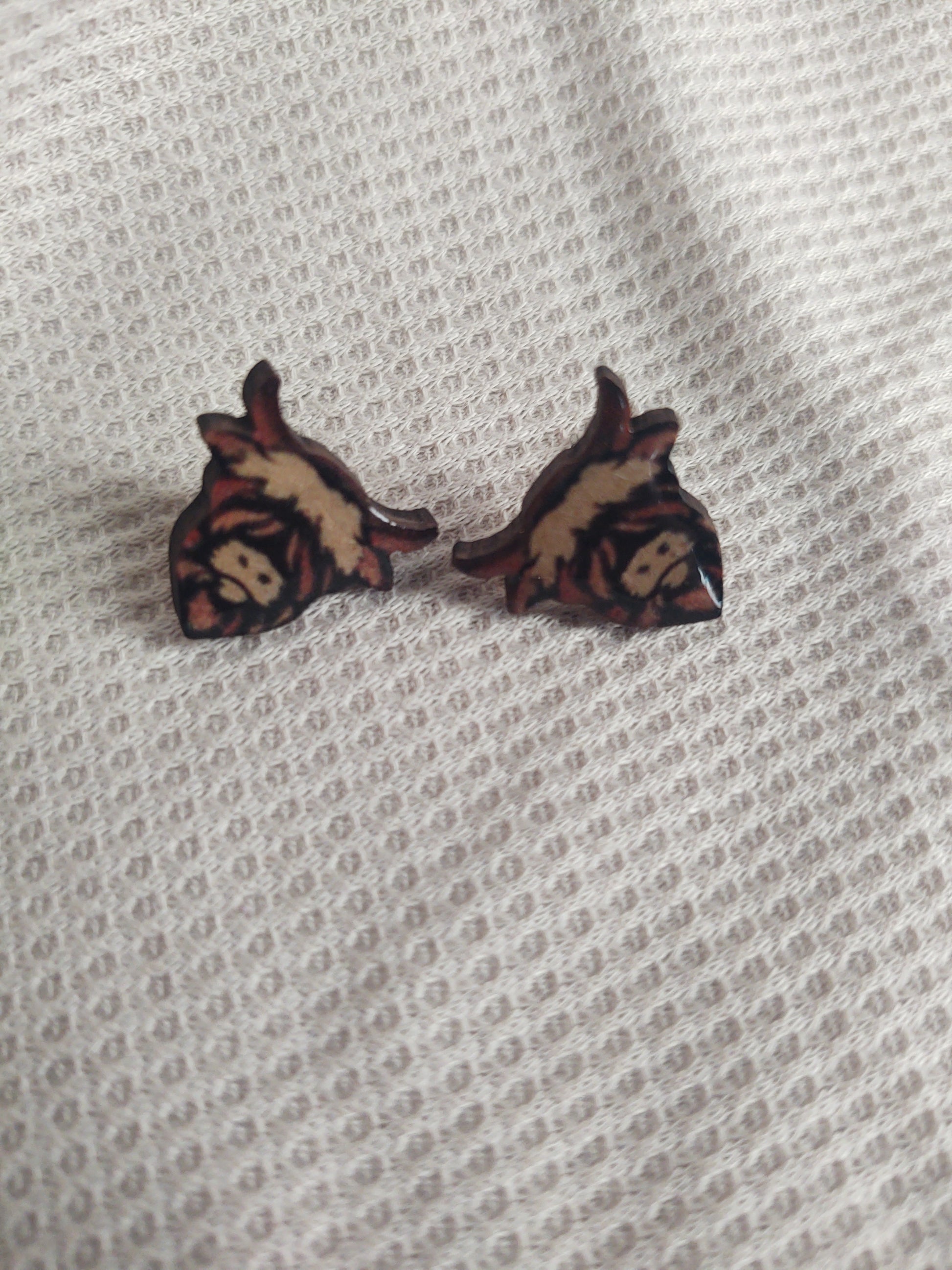 Laser cut resin topped wood earrings with gunmetal plated nickel free stainless steel posts.