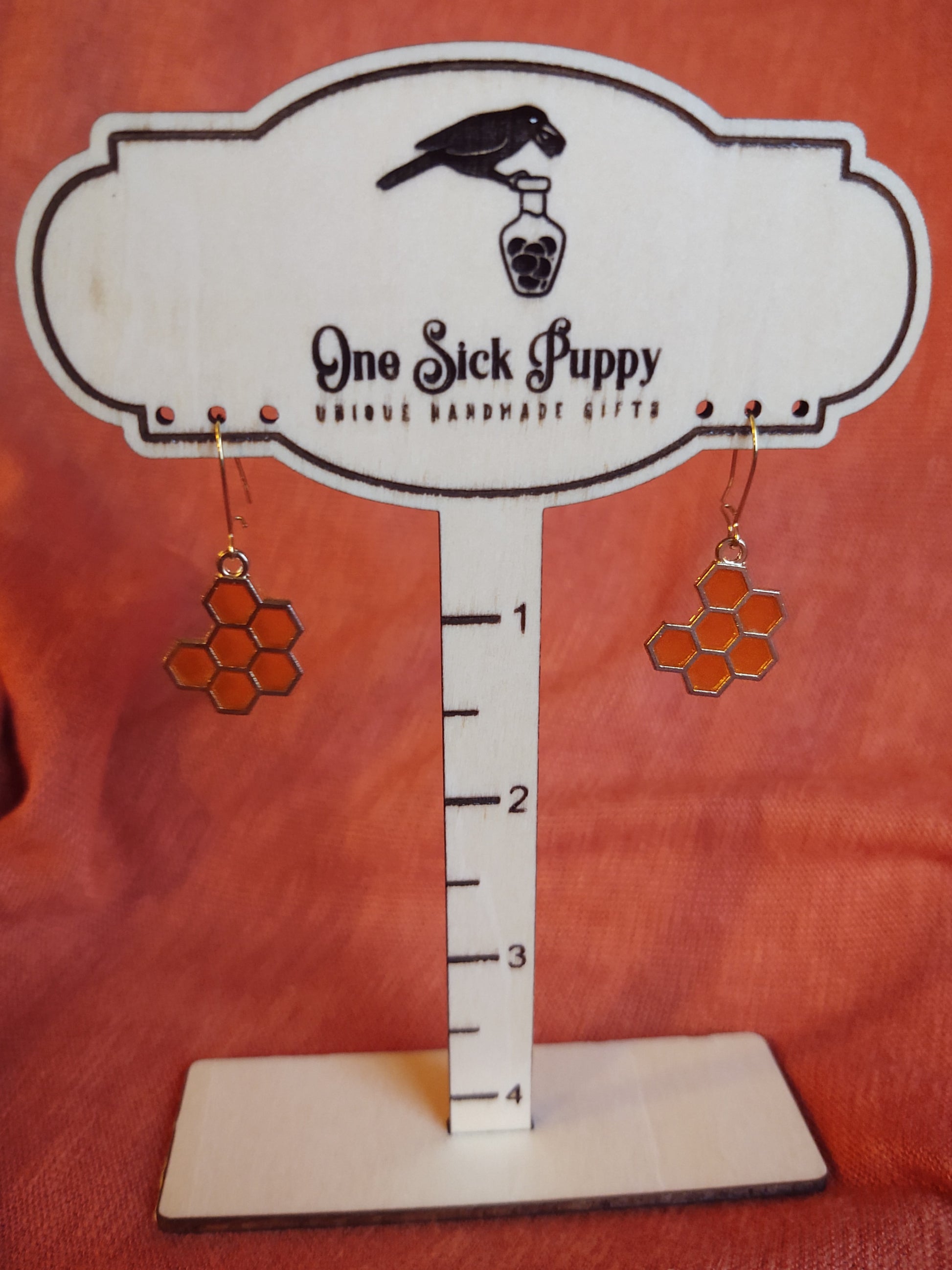 Metal and resin honeycomb dangles. Hooks are gold plated nickel free stainless steel.