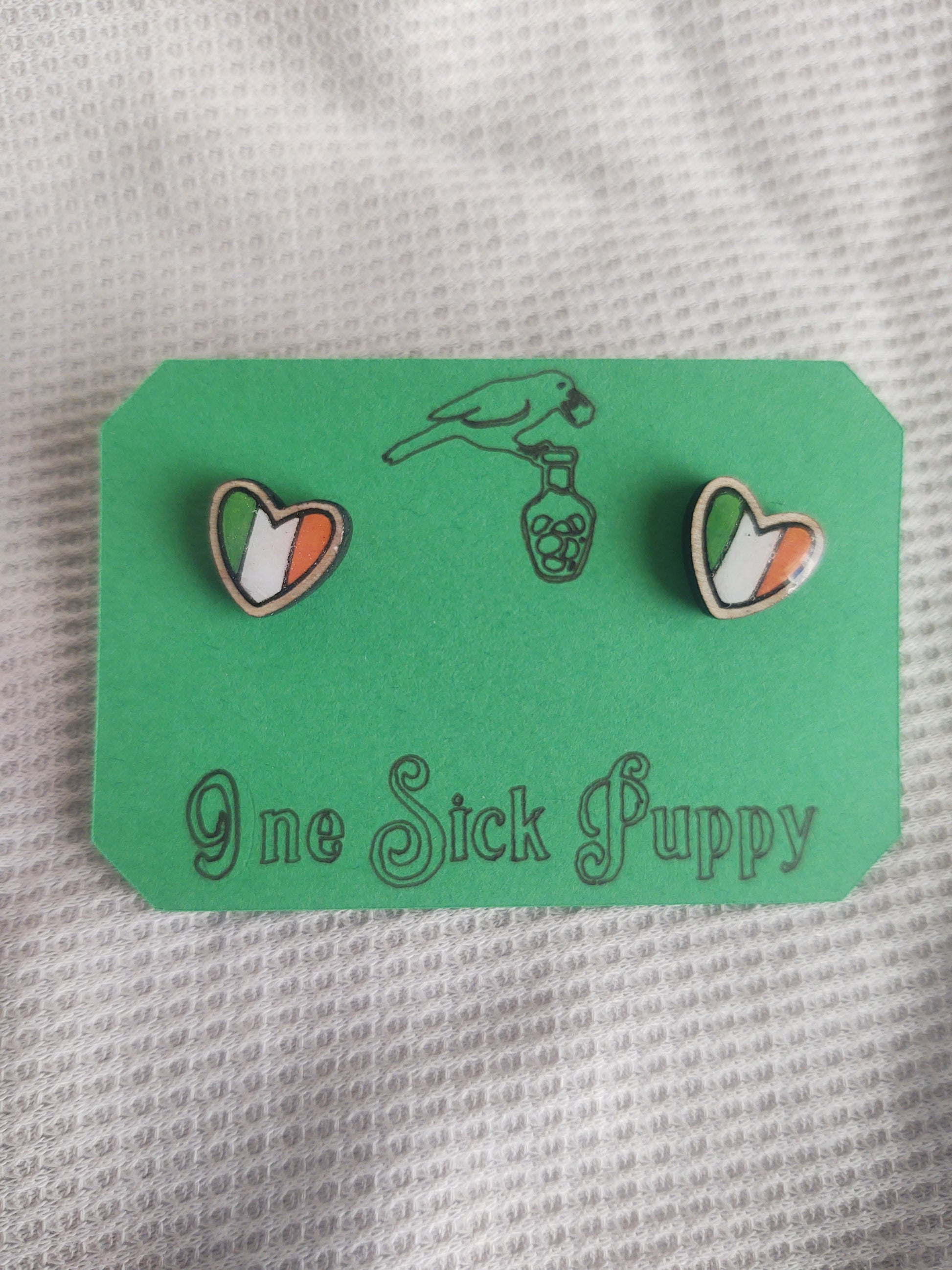 Laser cut resin topped wood earrings with nickel free stainless steel posts.