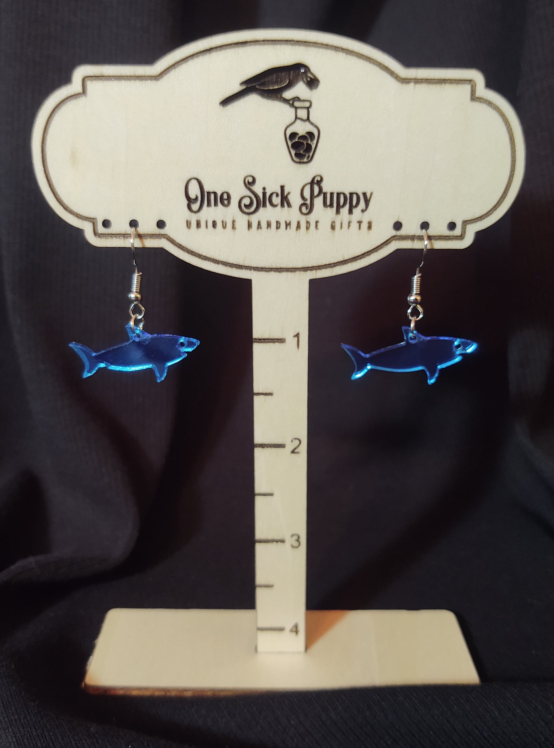 Laser cut acrylic mirror sharks. Silver plated nickel free stainless steel hooks.