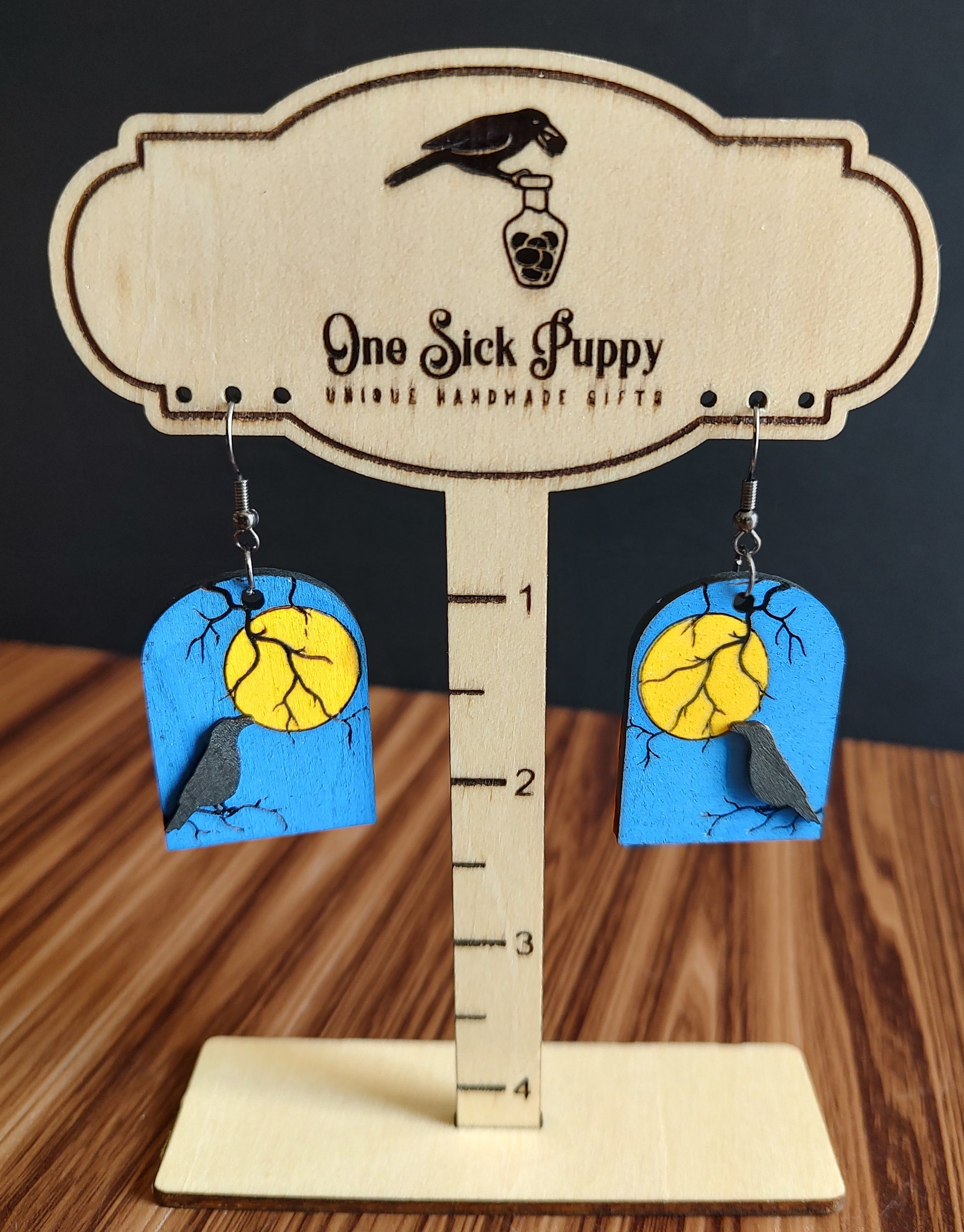 Laser cut hand painted wood earrings with nickel free stainless steel hooks.