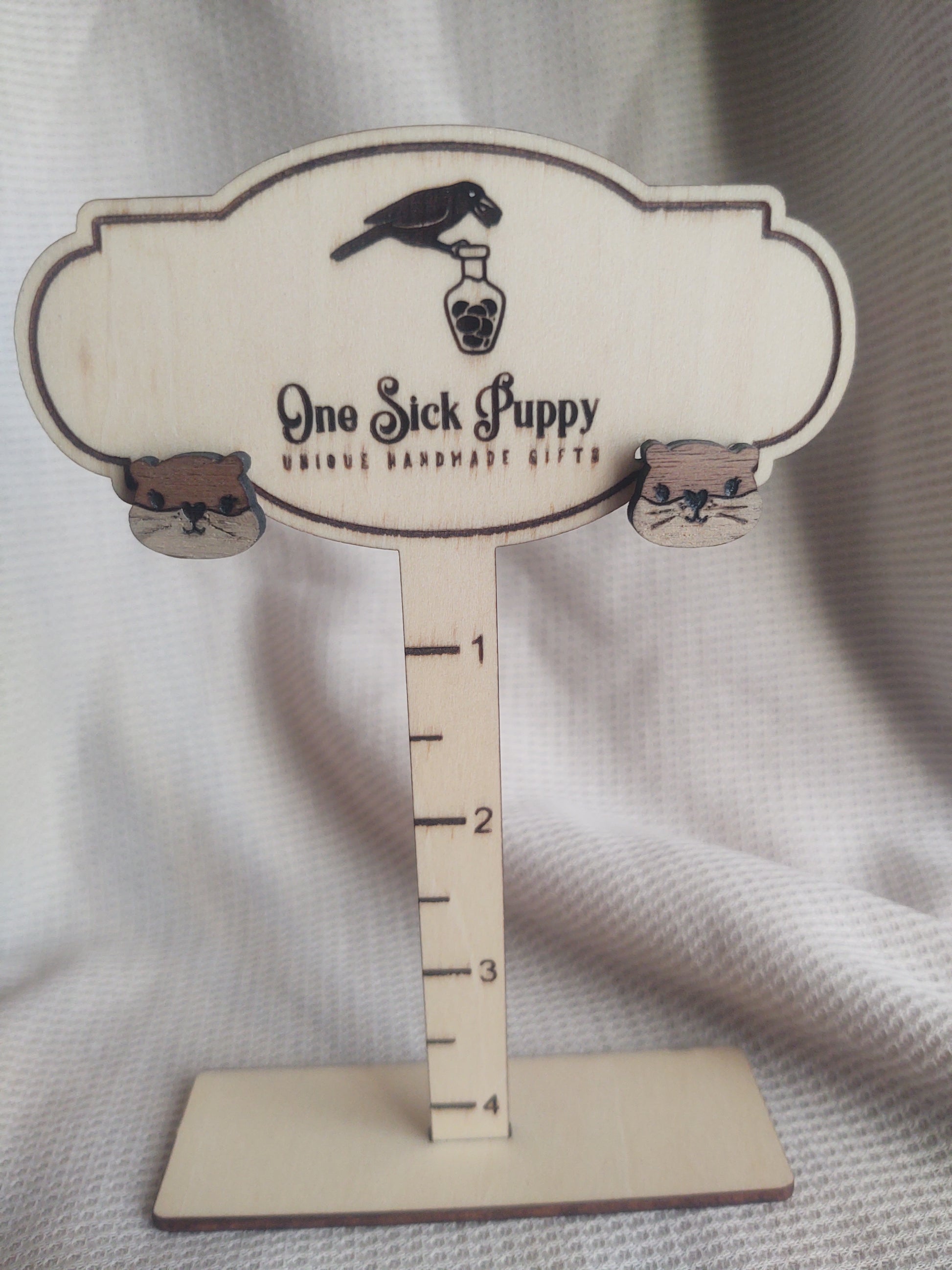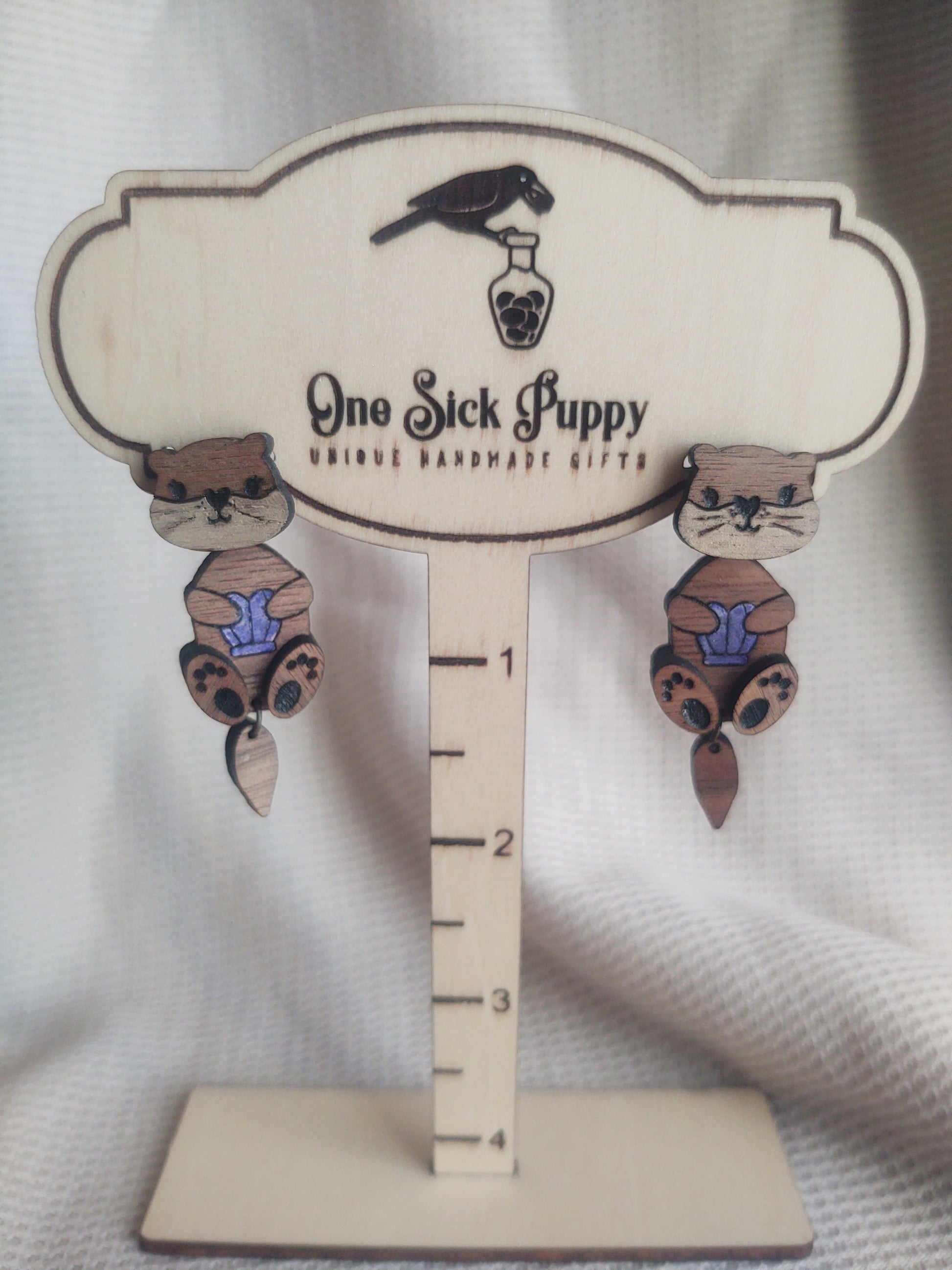 Laser cut hand painted wood earrings with nickel free stainless steel posts. These come with 2 backs and can be worn with or without the dangling back.