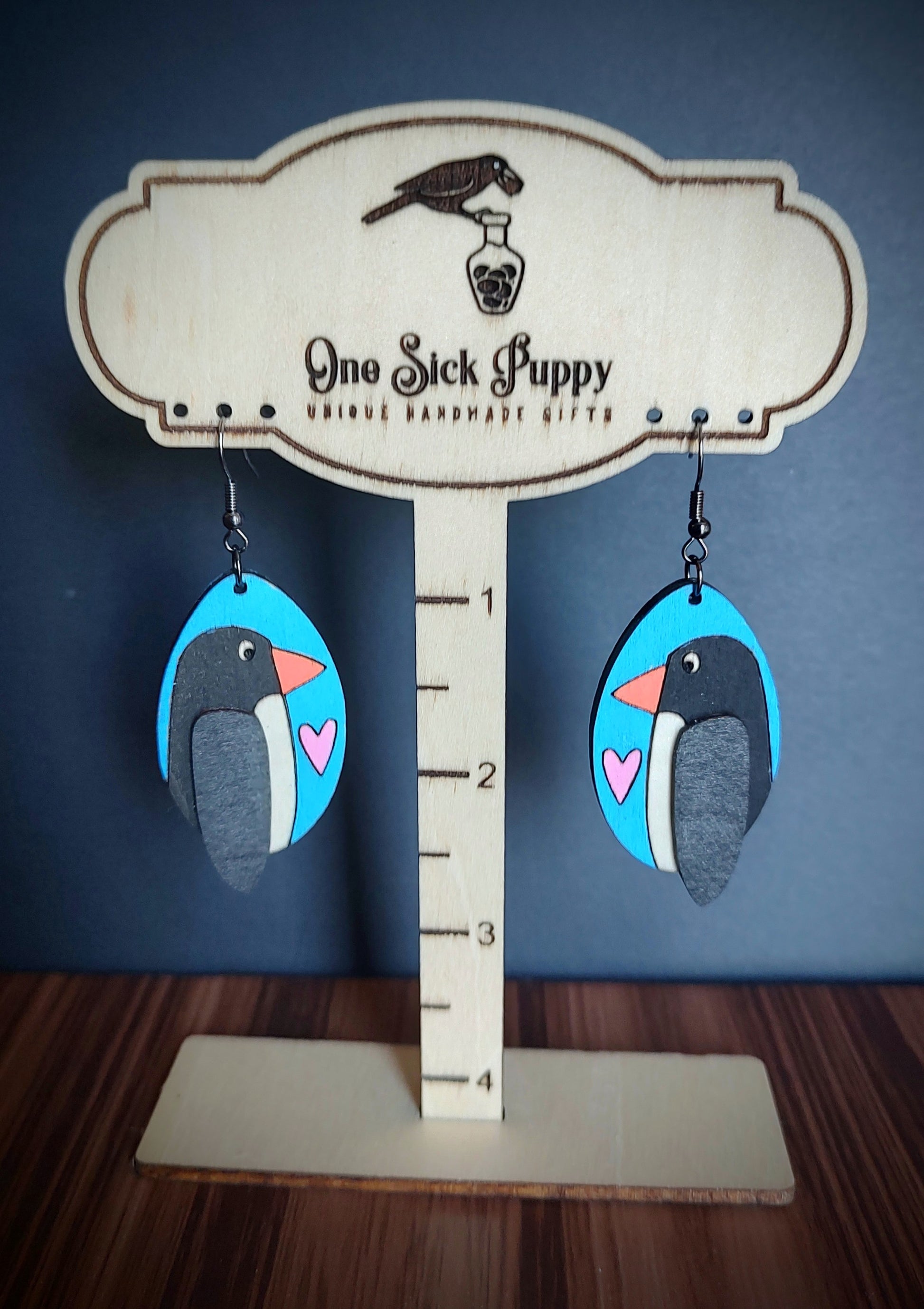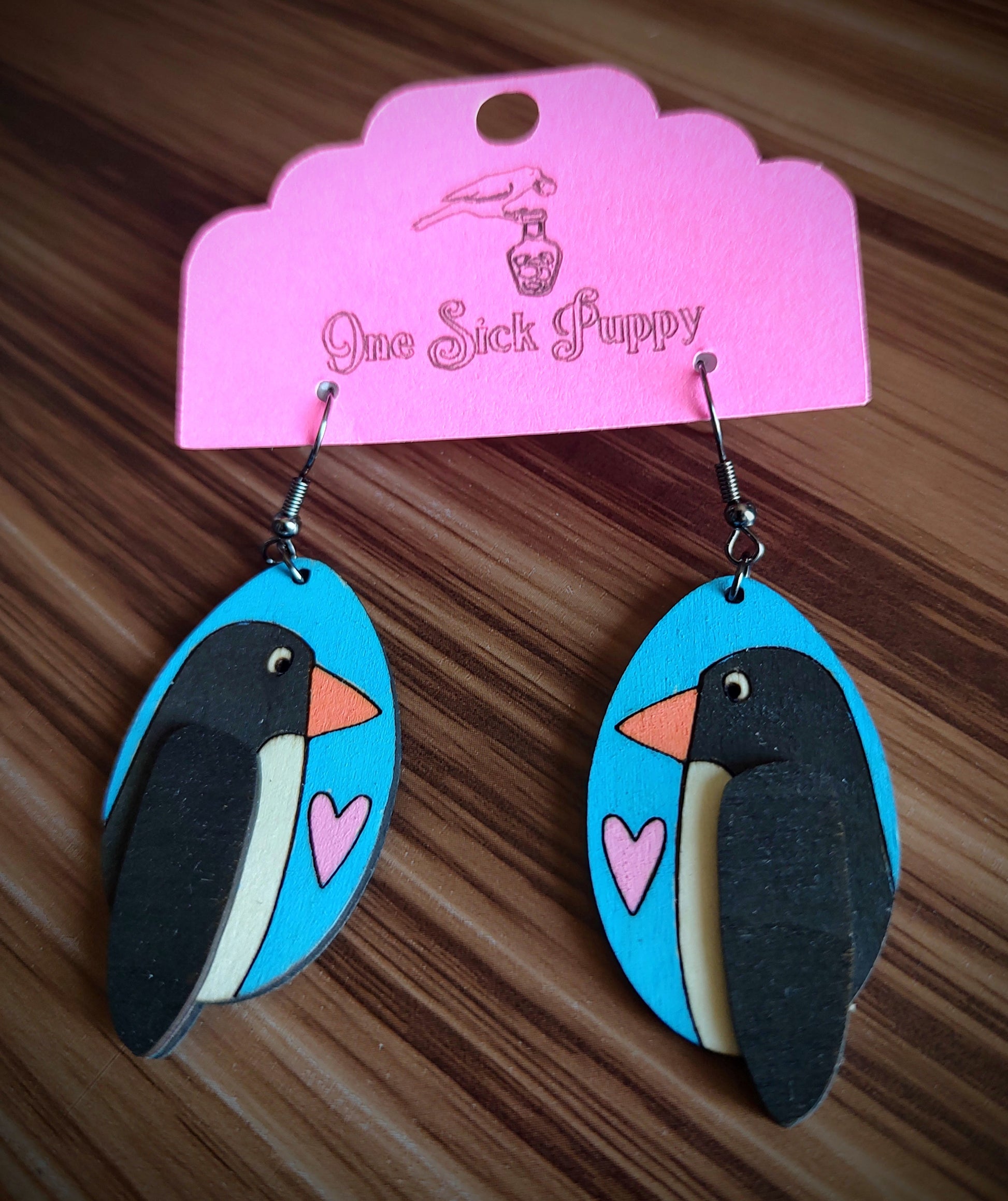 Hand painted, laser cut wooden earrings with nickel free stainless steel hooks.