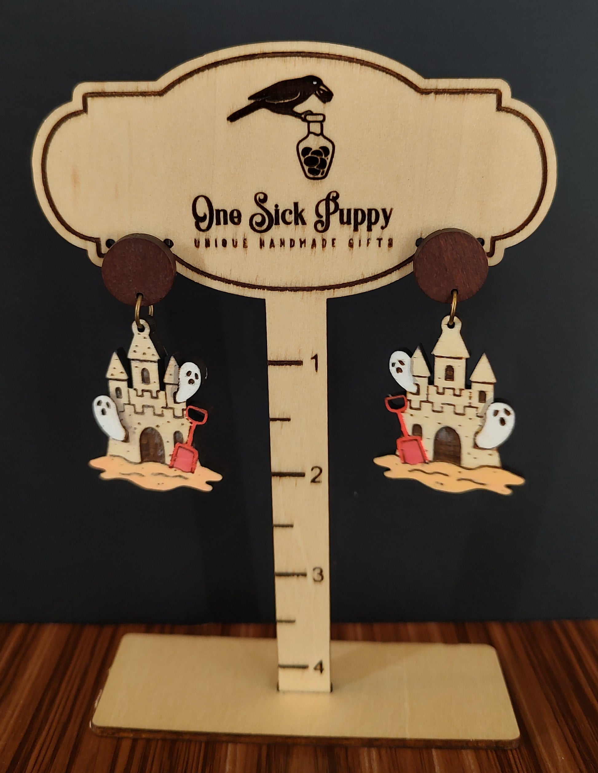 Lightweight laser cut hand painted wood dangle earrings with nickel free stainless steel posts.
