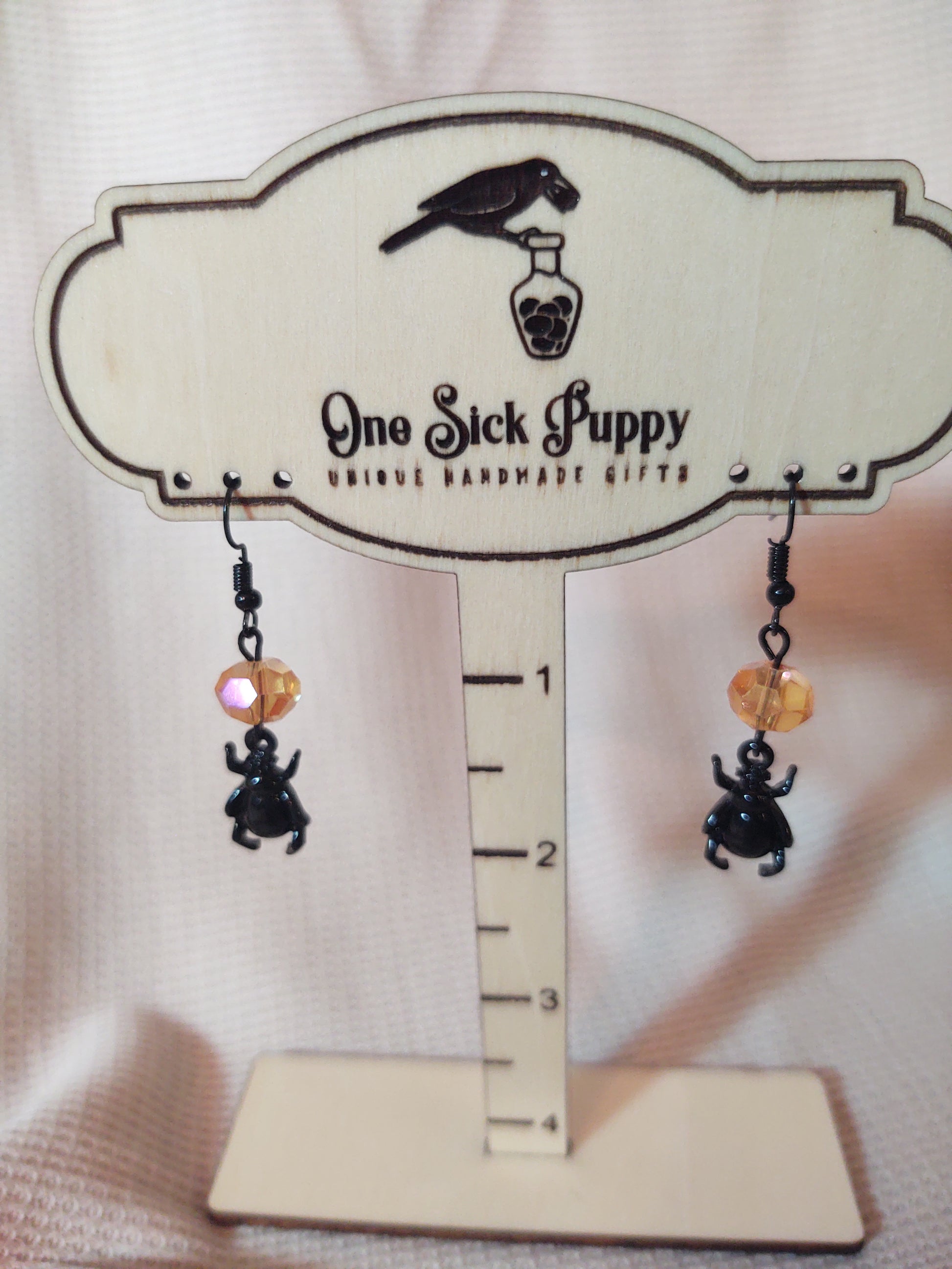 Metal beetle charms with glass accent beads. Hooks are black powder coated surgical stainless steel.