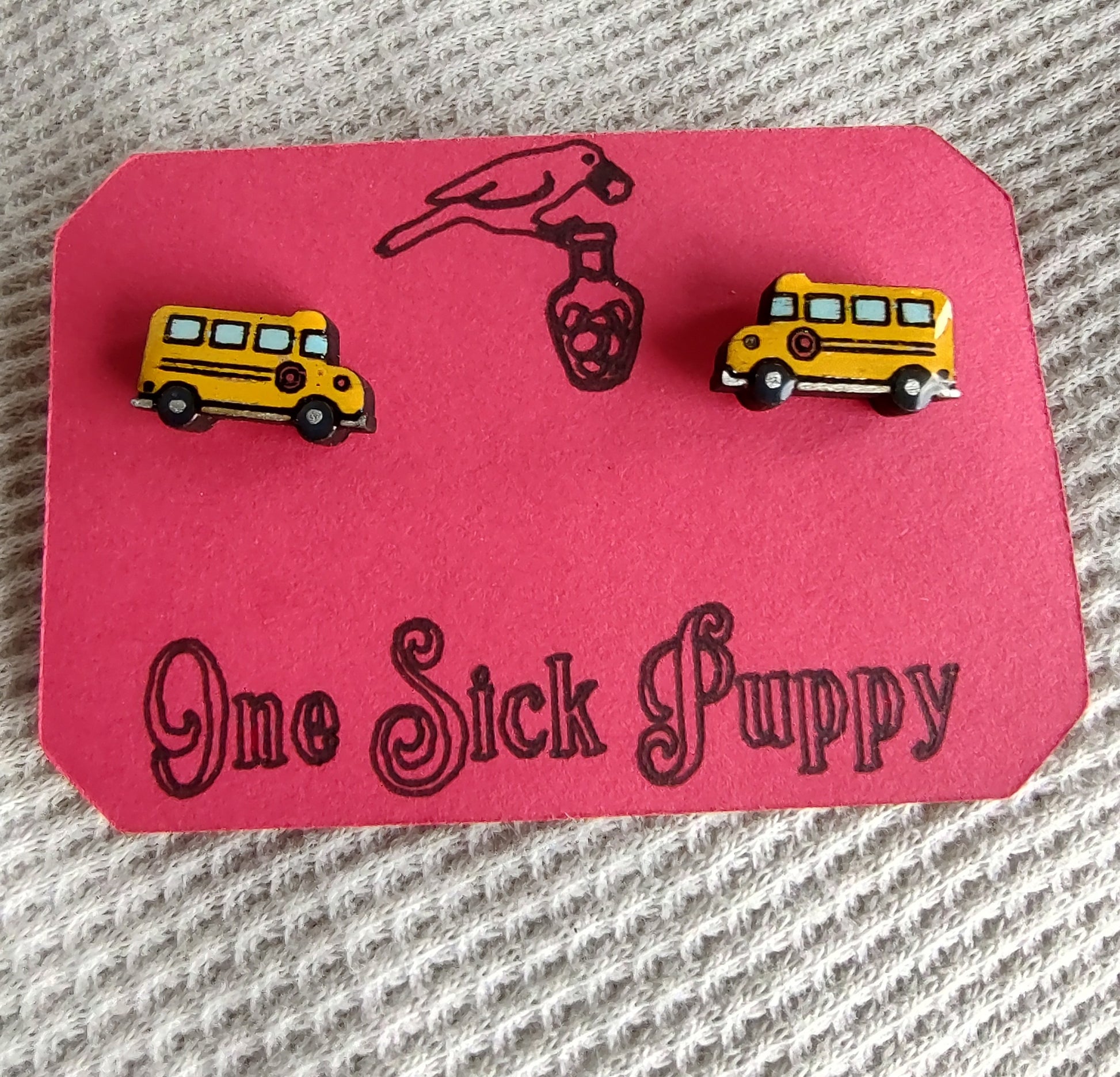 Laser cut, hand painted, resin topped wood earrings with gunmetal plated nickel free stainless steel posts.