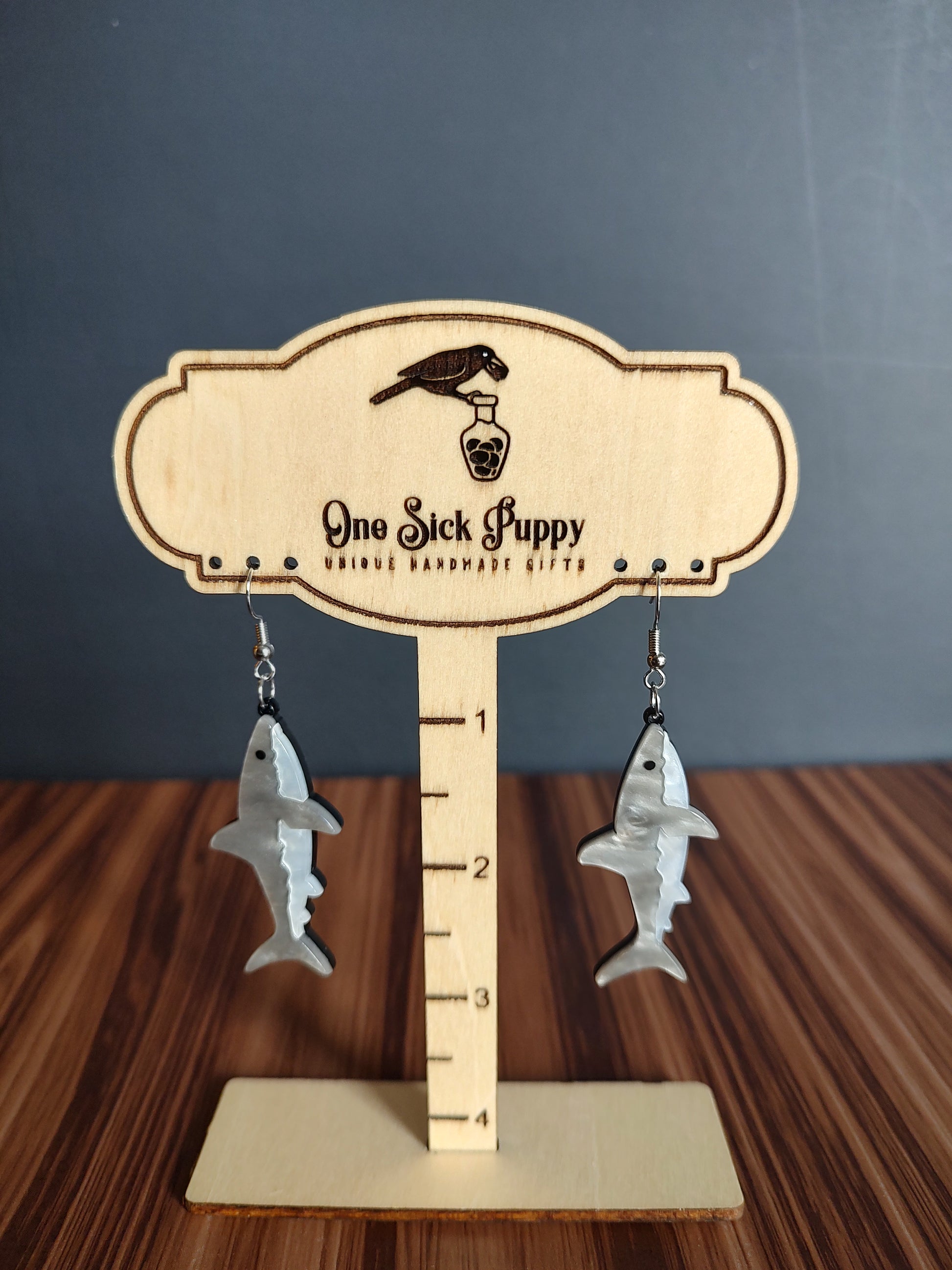 Make a splash with these playful acrylic shark dangle earrings! Lightweight and bold, they add a fun, ocean-inspired twist to any outfit. Perfect for shark lovers who want to show off their fierce style with a wink of whimsy. Lightweight acrylic with gunmetal plated nickel free stainless steel hooks.