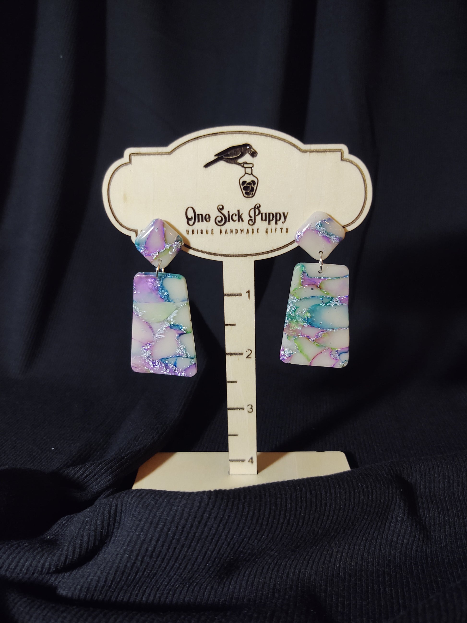 Polymer clay earrings with silver leaf accents. Posts are nickel free surgical steel. Due to the nature of the product each pair has variations of color and pattern.