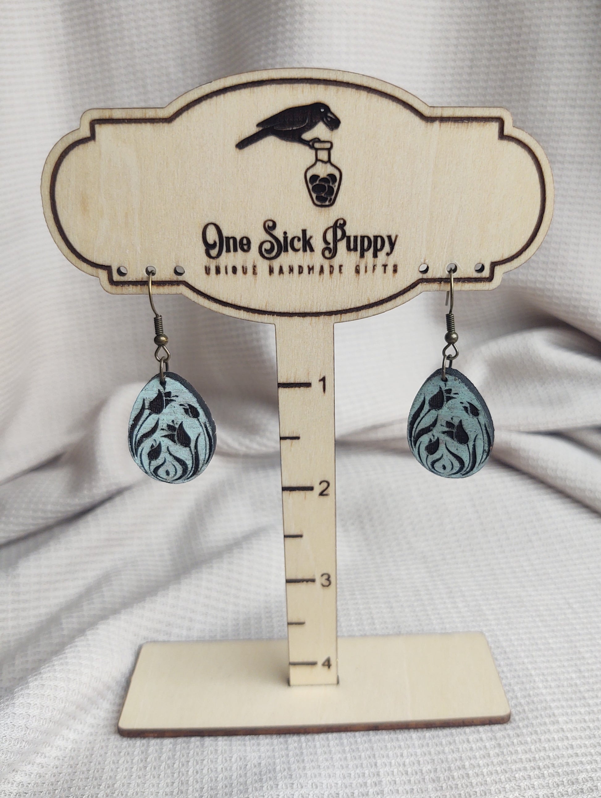 Laser cut wood dangles with bronze toned nickel free stainless steel hooks.