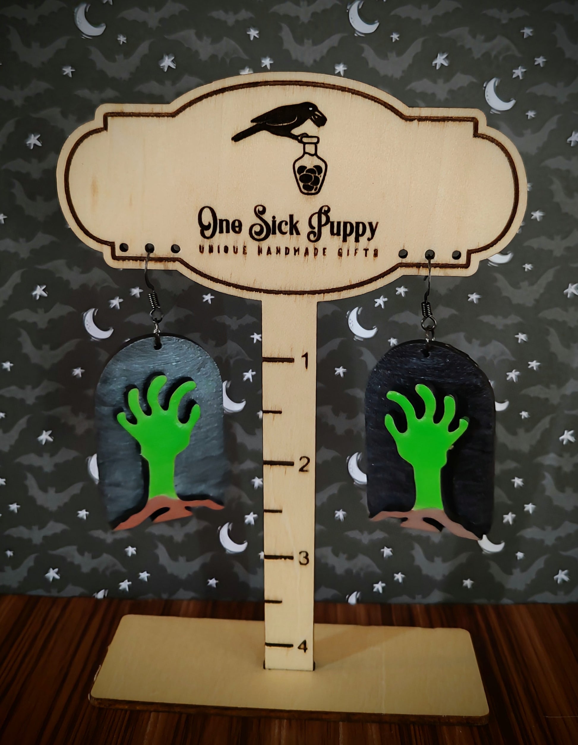 Lightweight laser cut hand painted glow in the dark wood dangle earrings with nickel free stainless steel hooks.