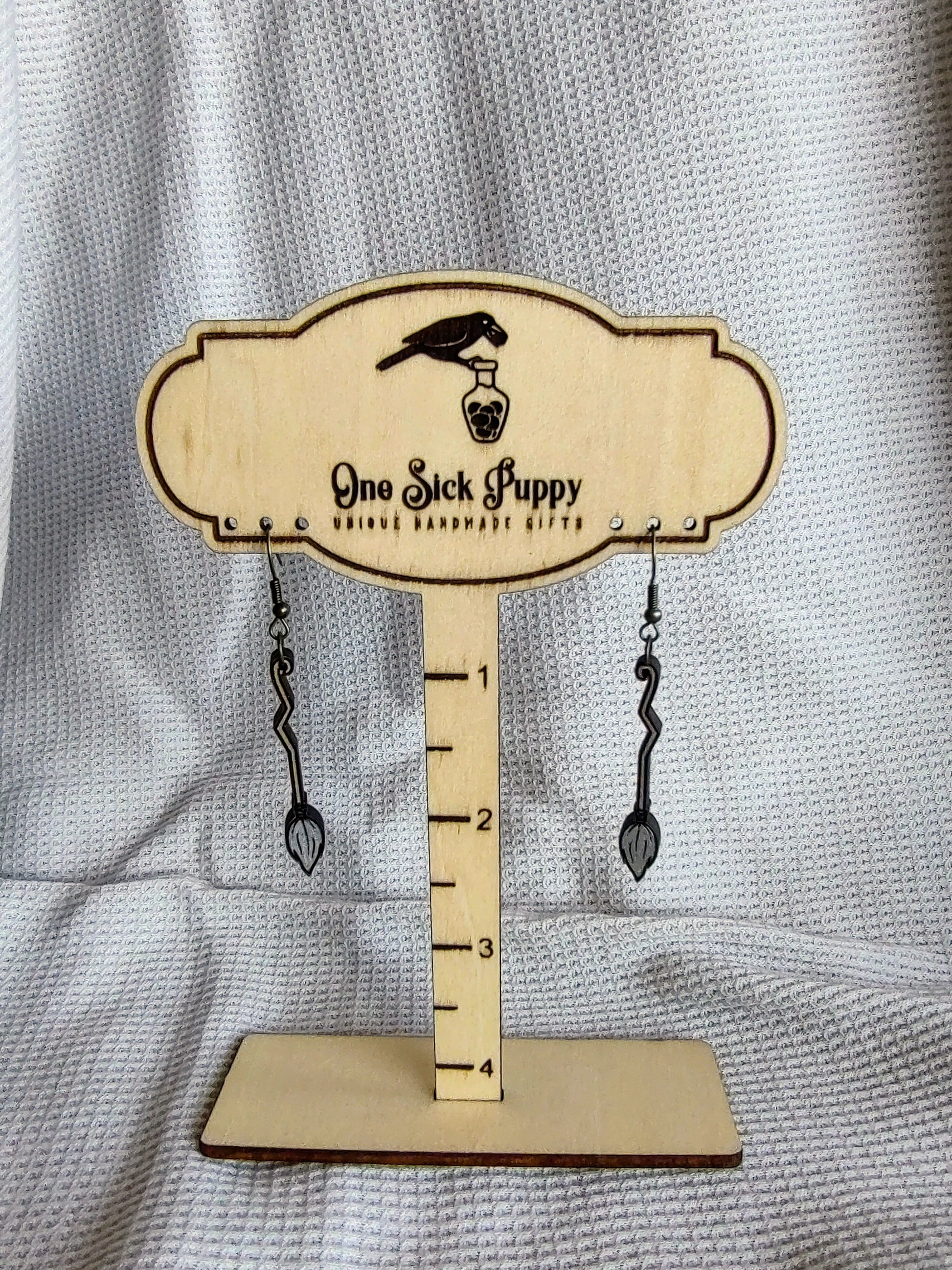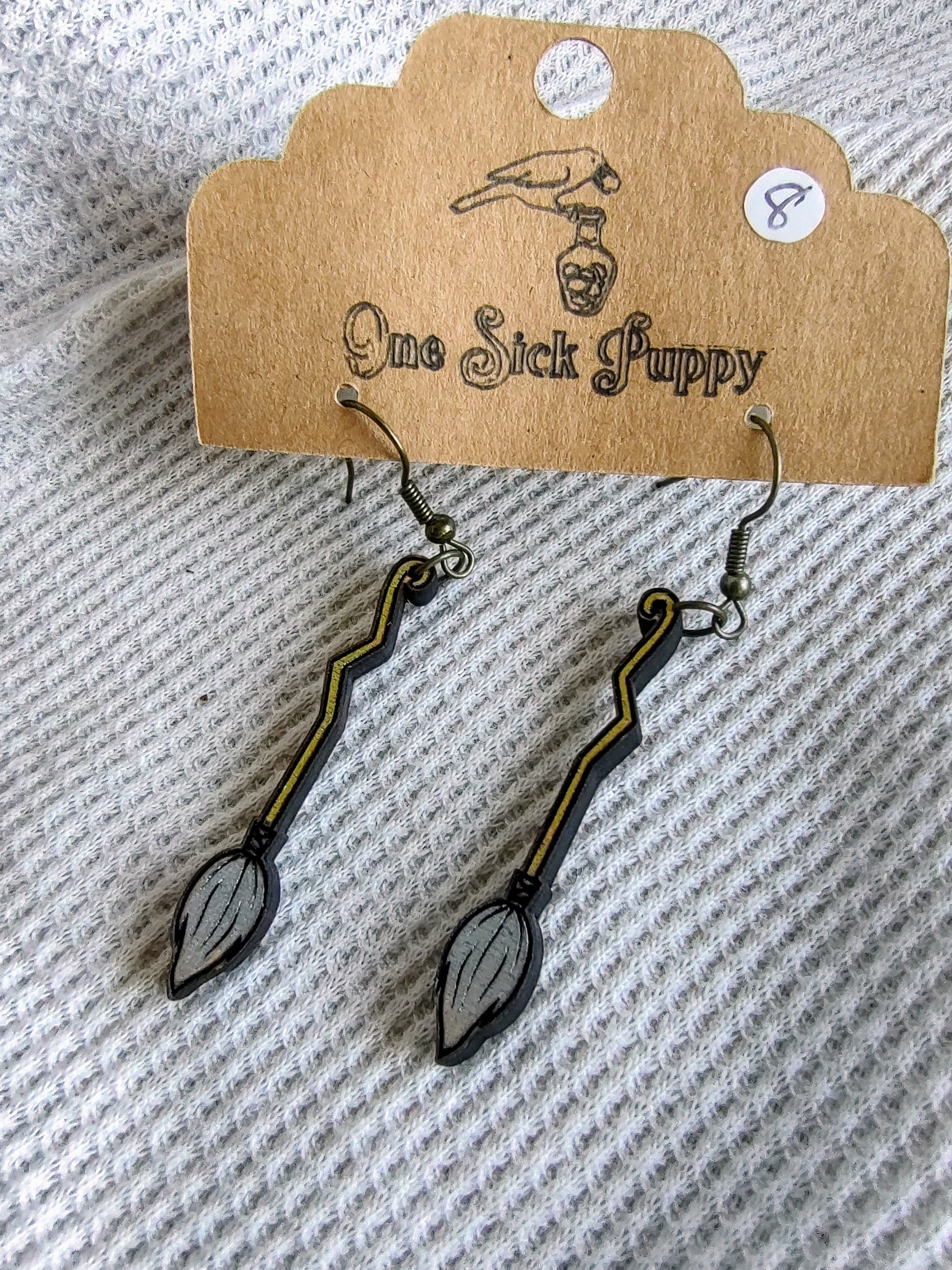 Laser cut, hand painted wood earrings with plated nickel free stainless steel hooks.